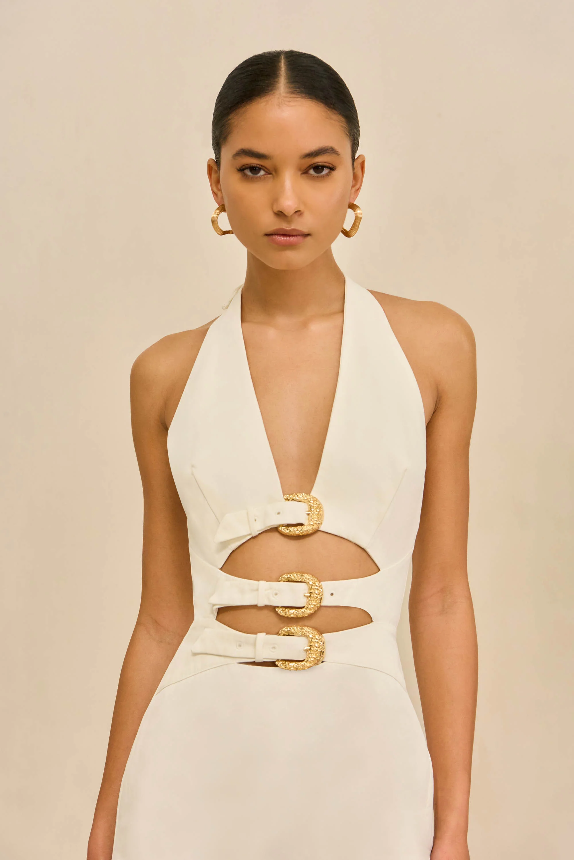 A halter mini-dress with adjustable, textured shiny brass buckles.