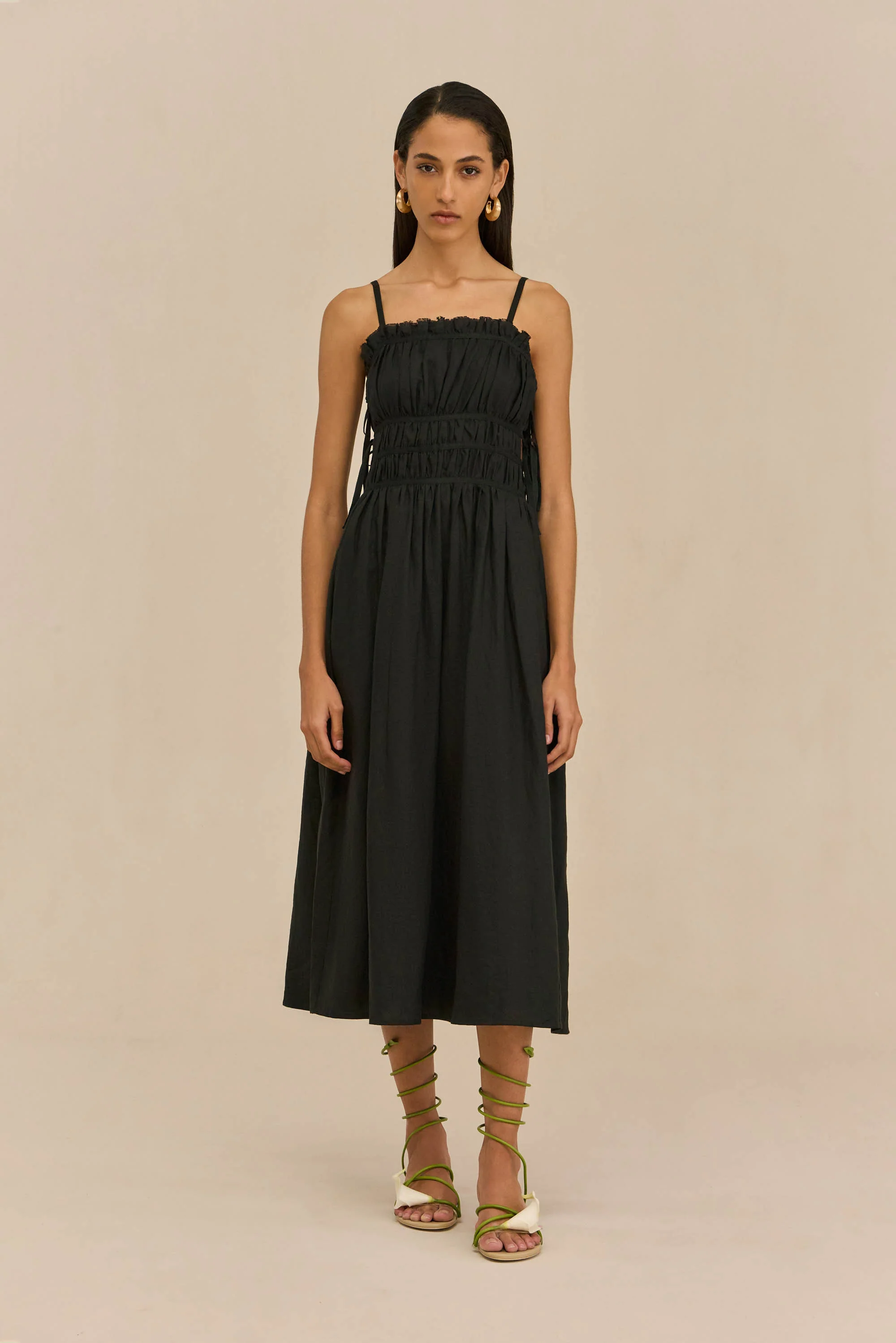 A linen midi dress designed with gathered bodice detailing, delicate straps, and a softly flared skirt for an effortless silhouette.