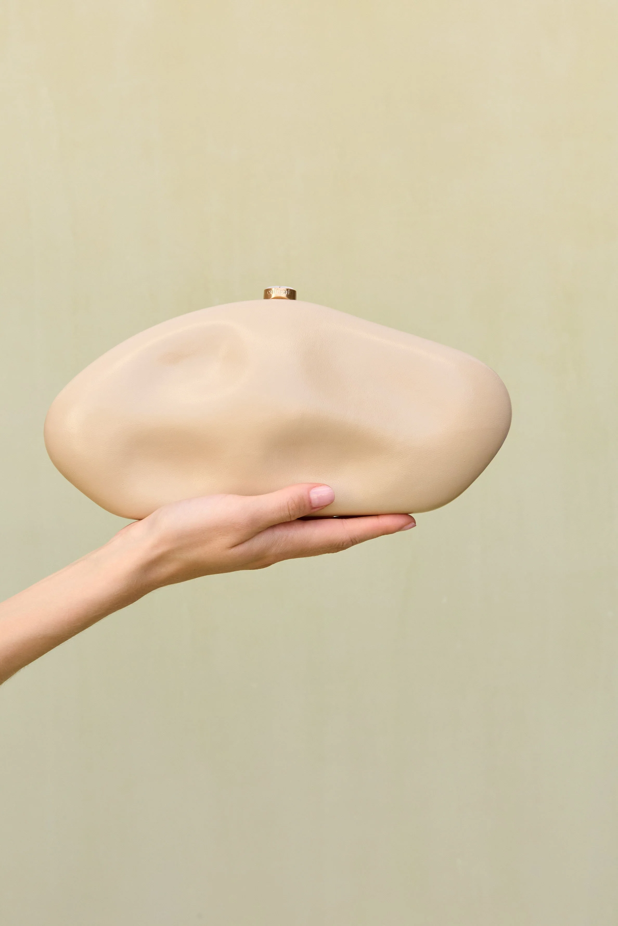 A sculptural clutch wrapped in leather with a flat bottom and gold clasp at the top.