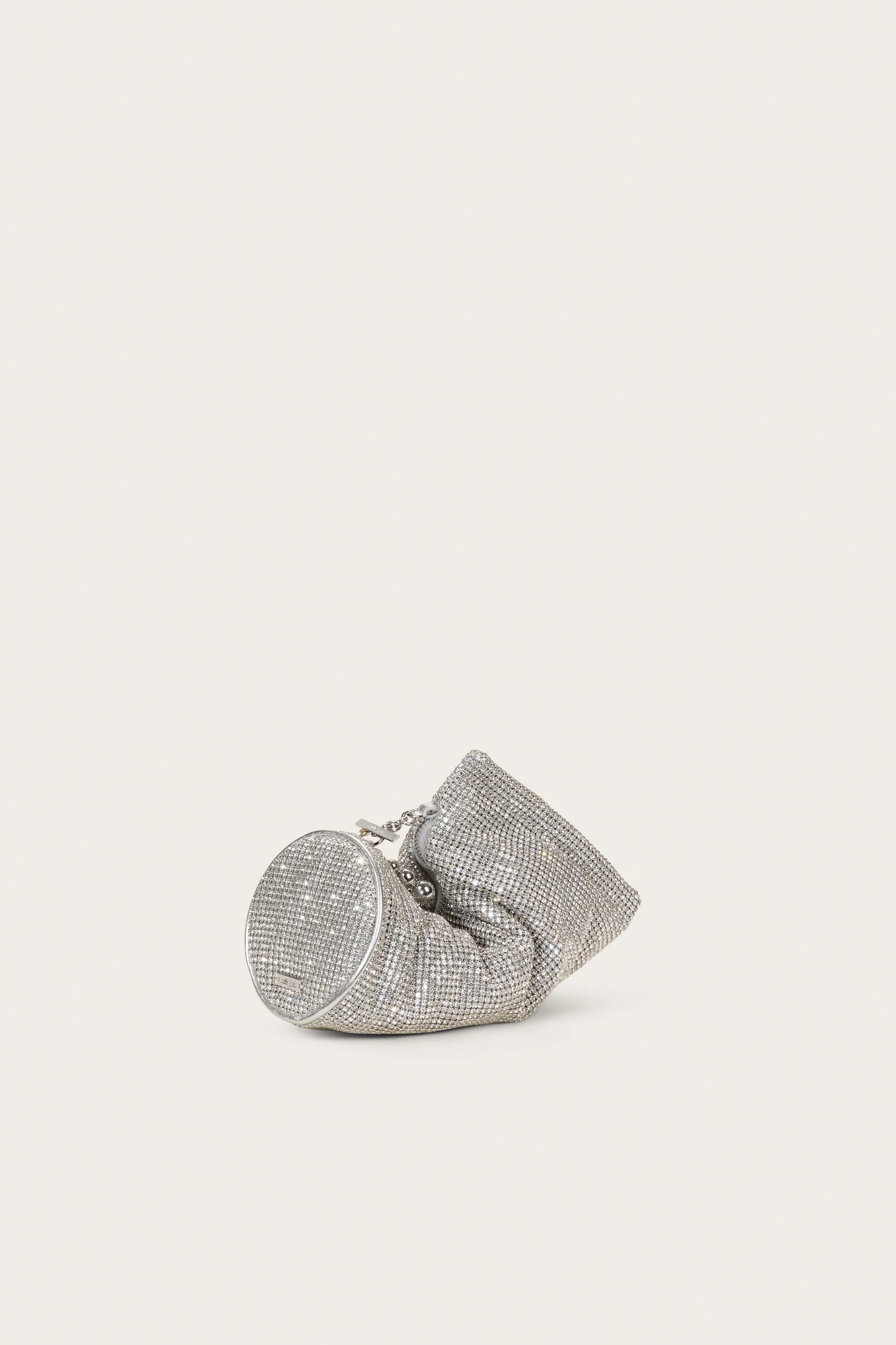 A rhinestone adorned clutch with silver-toned hardware and a zipper closure.