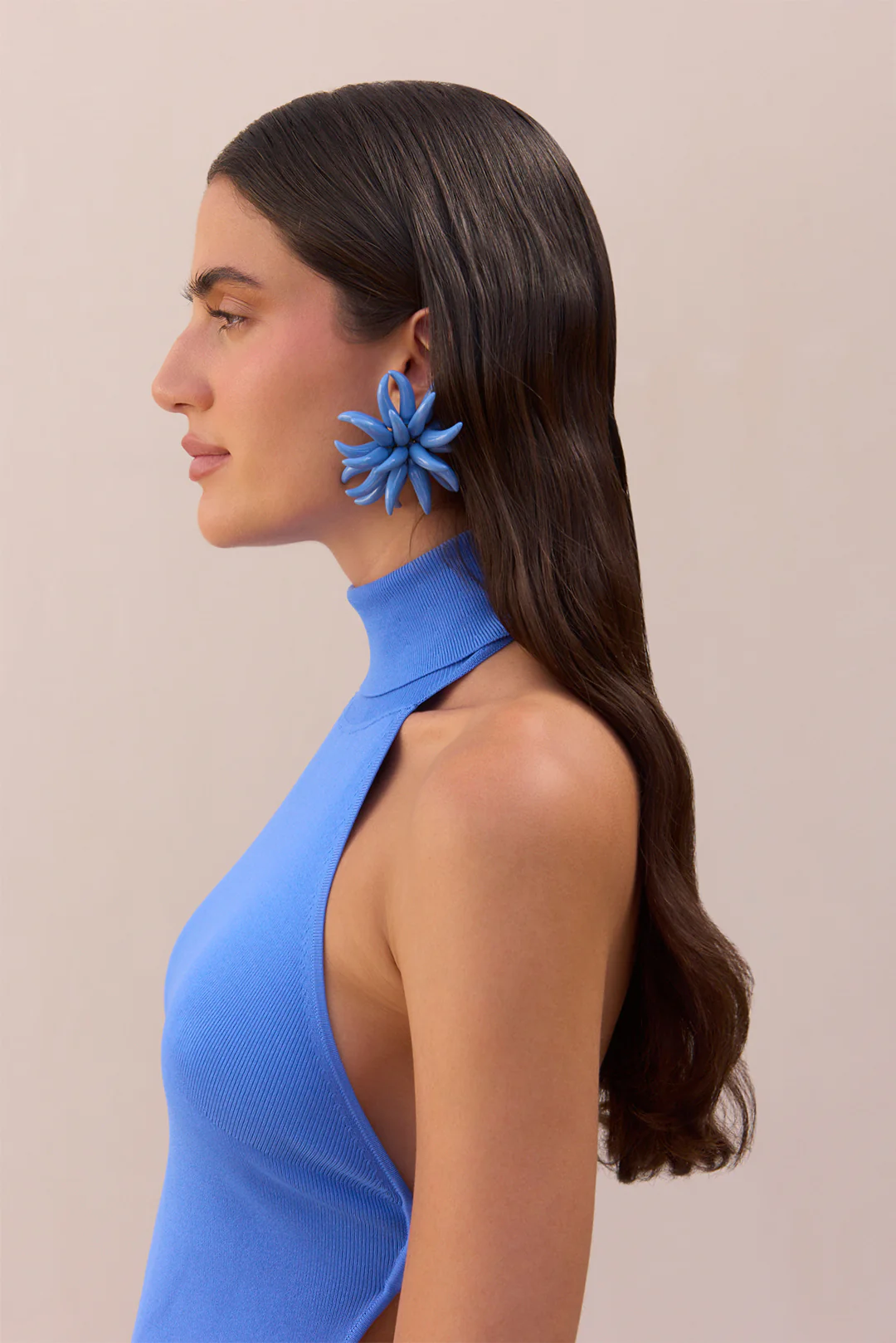 A high-neck, fully open-back halter top with wide back strap and narrow mock neckline.