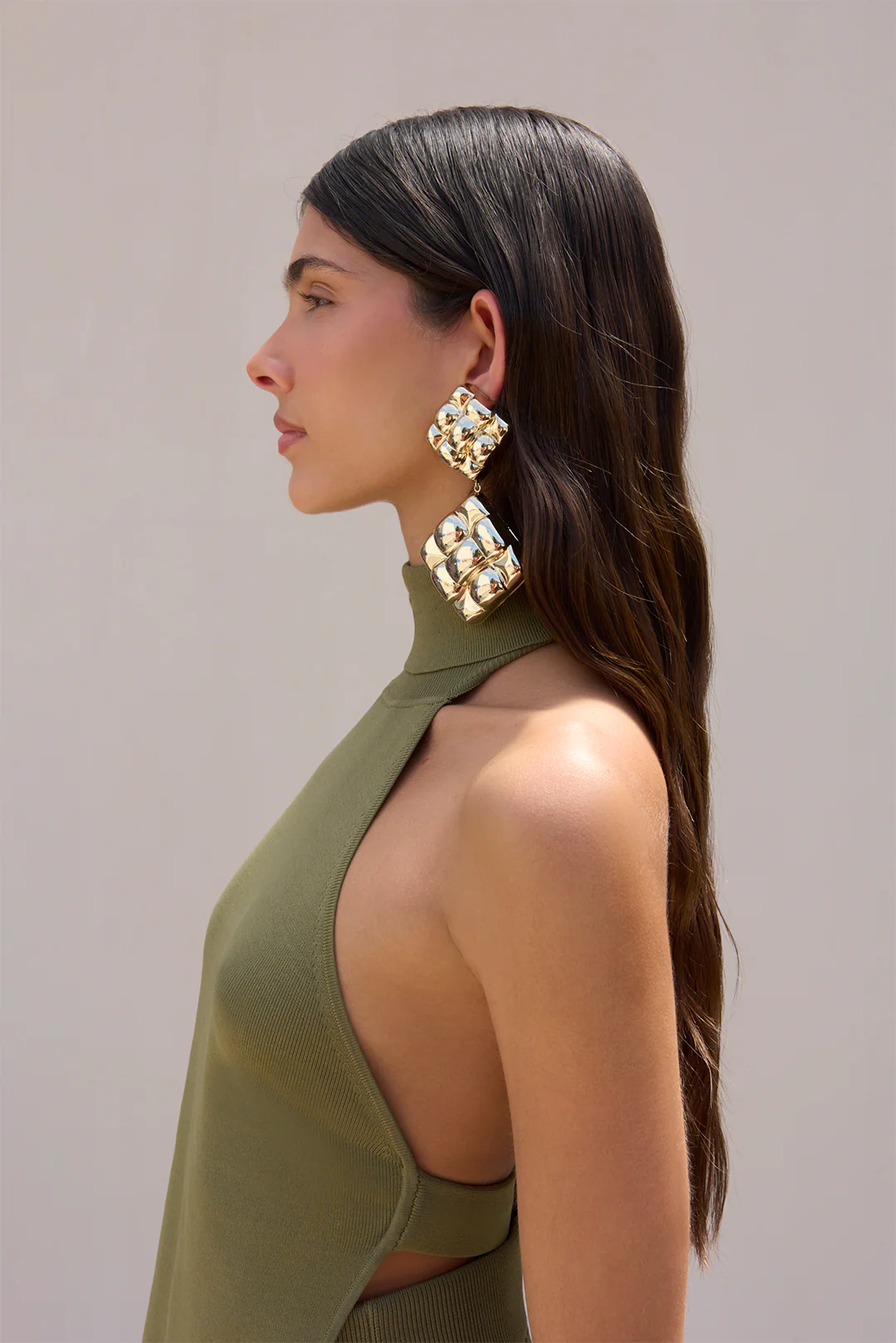 A high-neck, fully open-back halter top with wide back strap and narrow mock neckline.