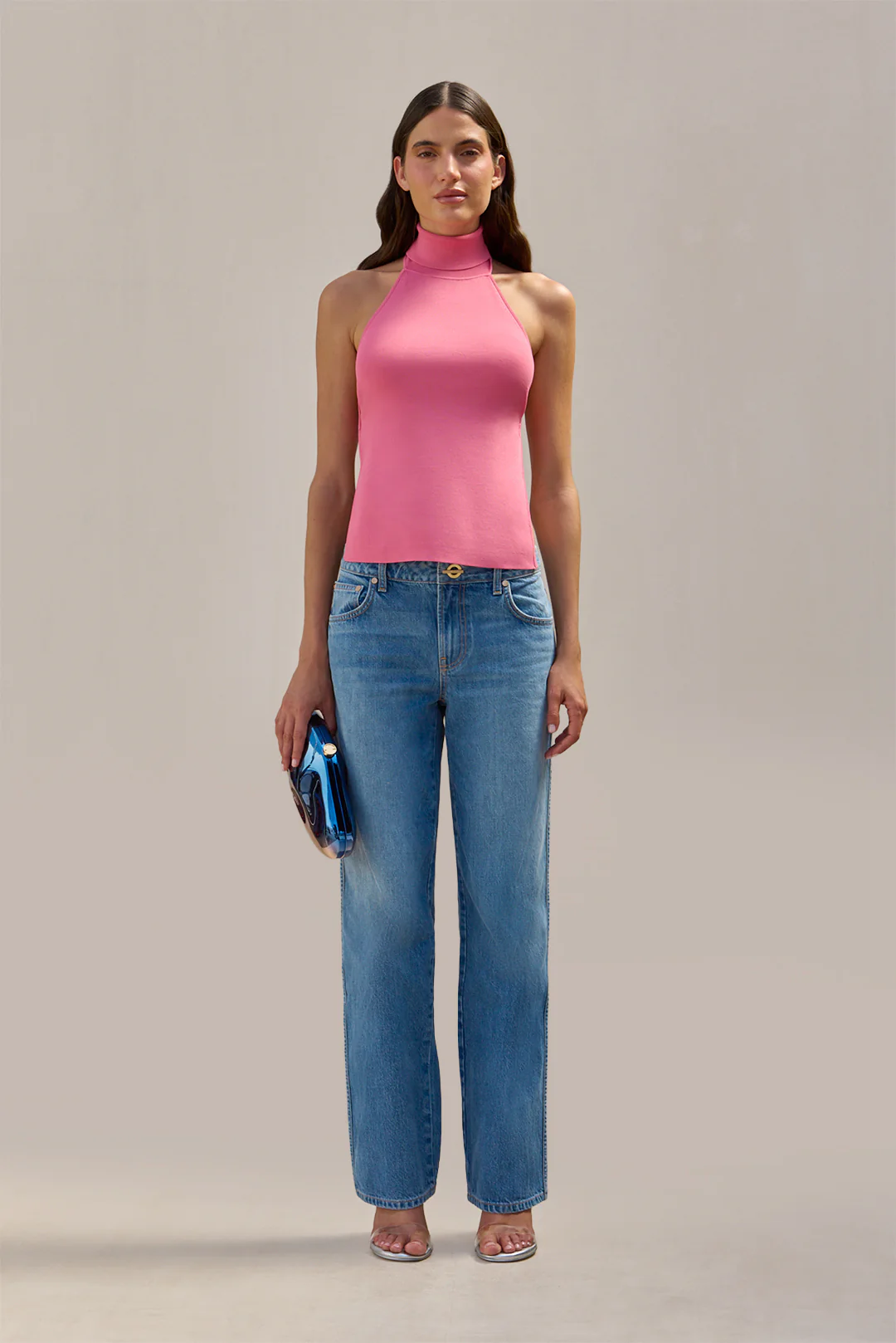 A high-neck, fully open-back halter top with wide back strap and narrow mock neckline.